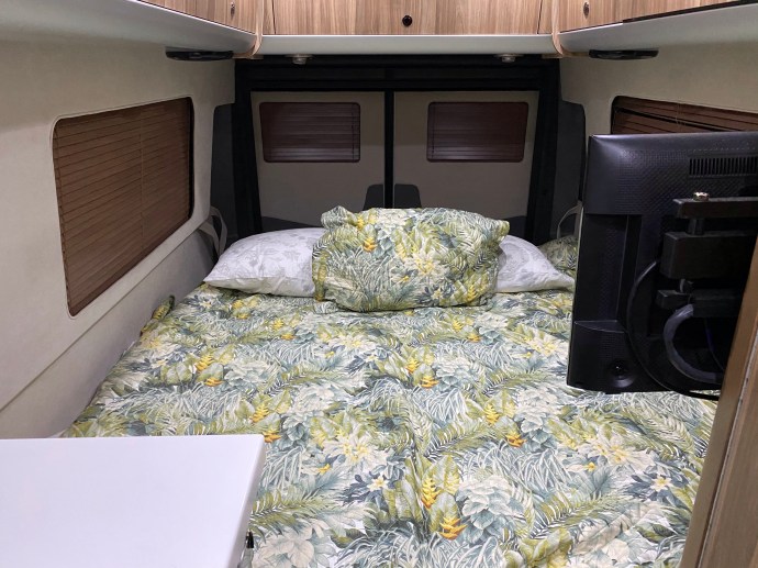 Some of you have asked about the interior of our RV. Here are a few pictures of the couch and bed complete with Tommy Bahama bedding, cute pillows and an adorable dog. The cabinet to the left is my three square foot closet!